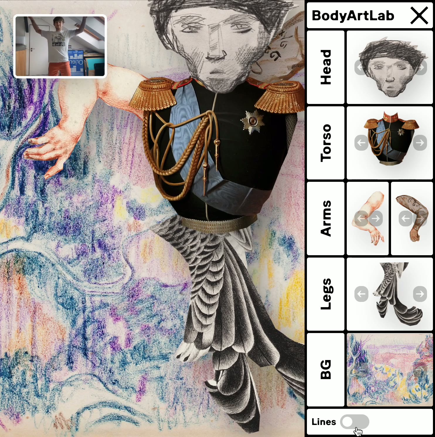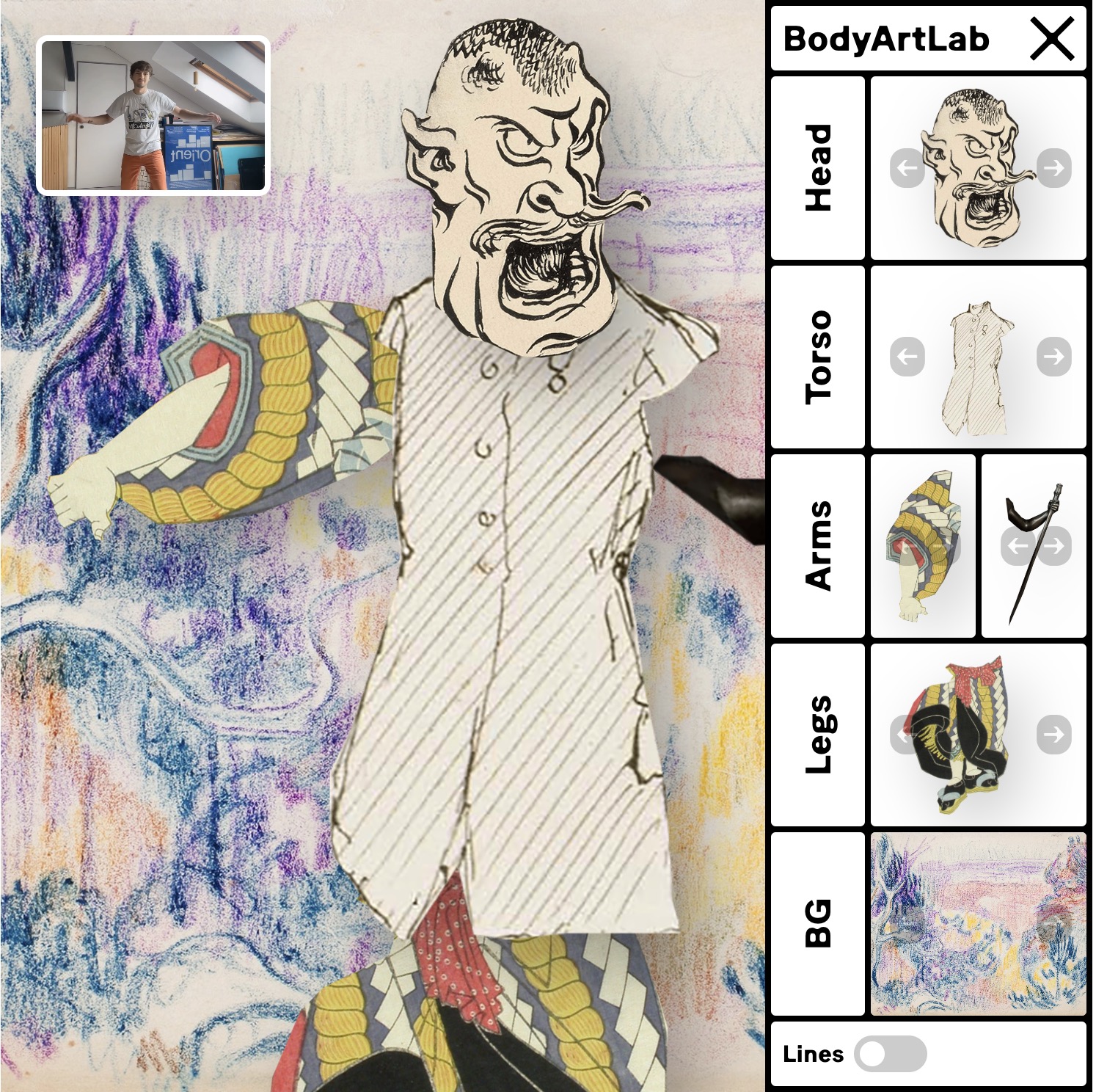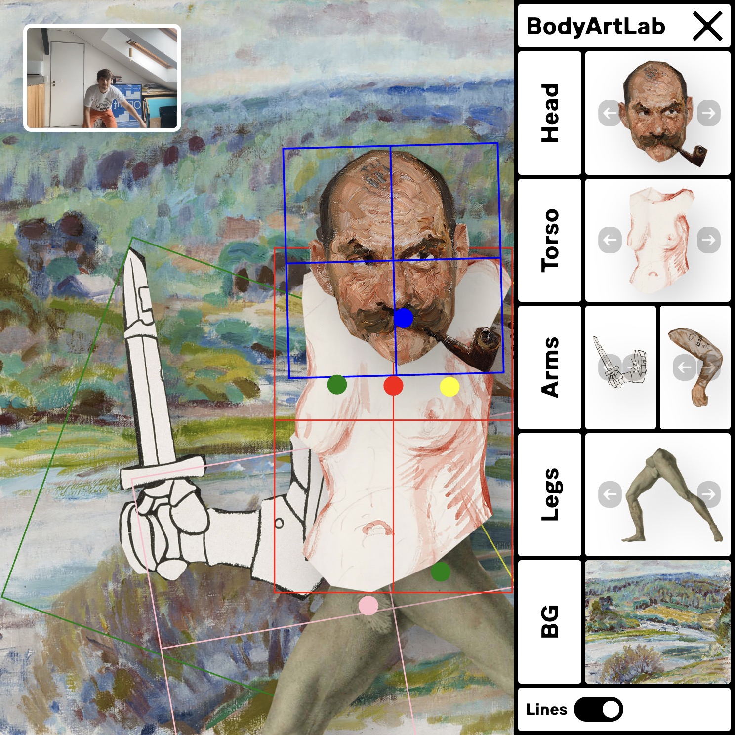 The central theme is to explore how the human body can serve as an intuitive interface, fostering a unique and immersive digital experience. Through the transformative power of creative coding and body tracking, BodyArtLab invites users into a new realm of interactive art, where the body itself becomes a canvas for digital creativity.