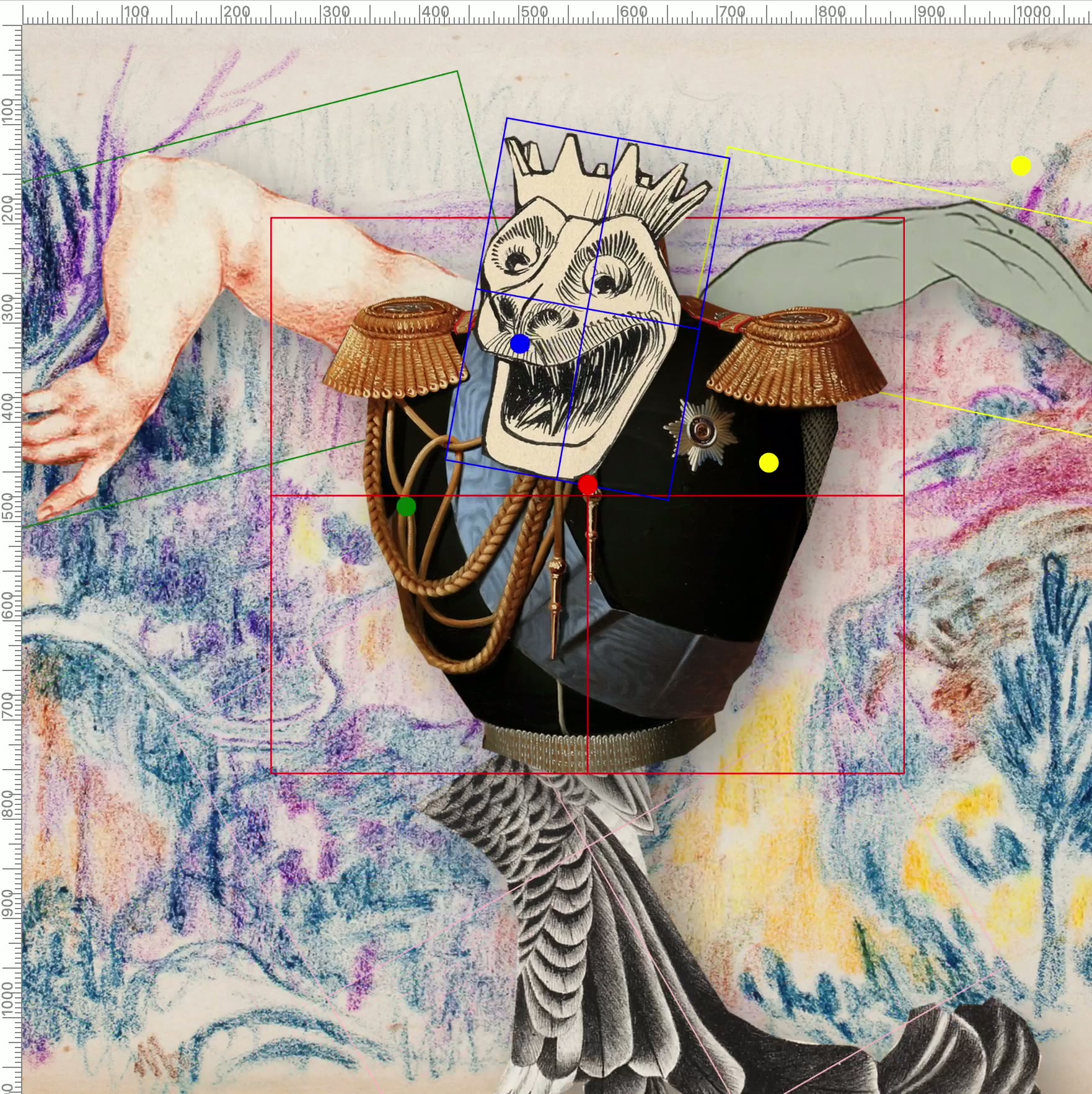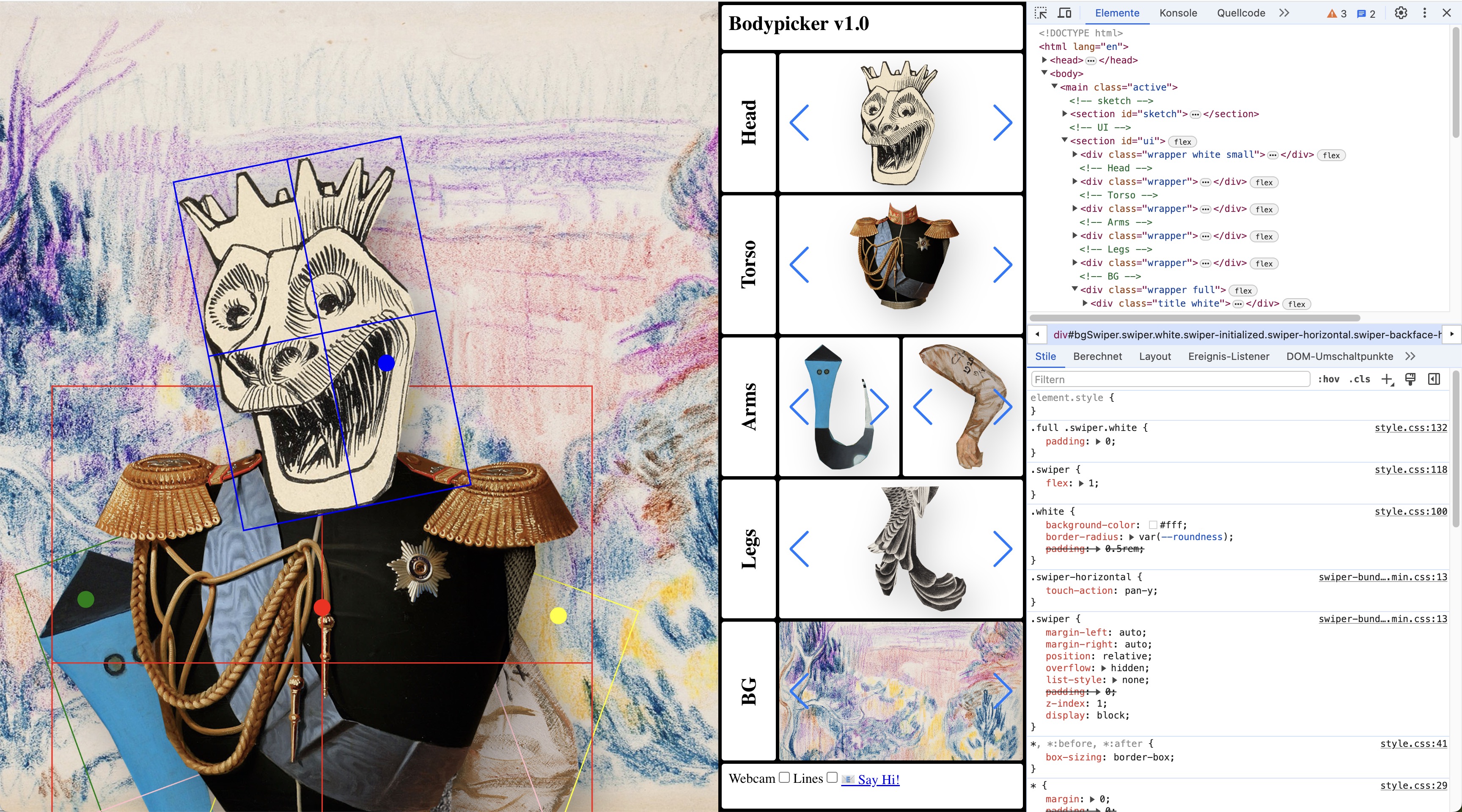 Inspired by the 1946 illustrated children’s book "Heads, Bodies & Legs" by Richard Chopping and Denis Wirth-Miller, BodyArtLab randomly combines body parts to create a new collage each time the sketch is loaded. The resulting generative collage body reacts to human movement and gestures transforming our body into a playful interface.
