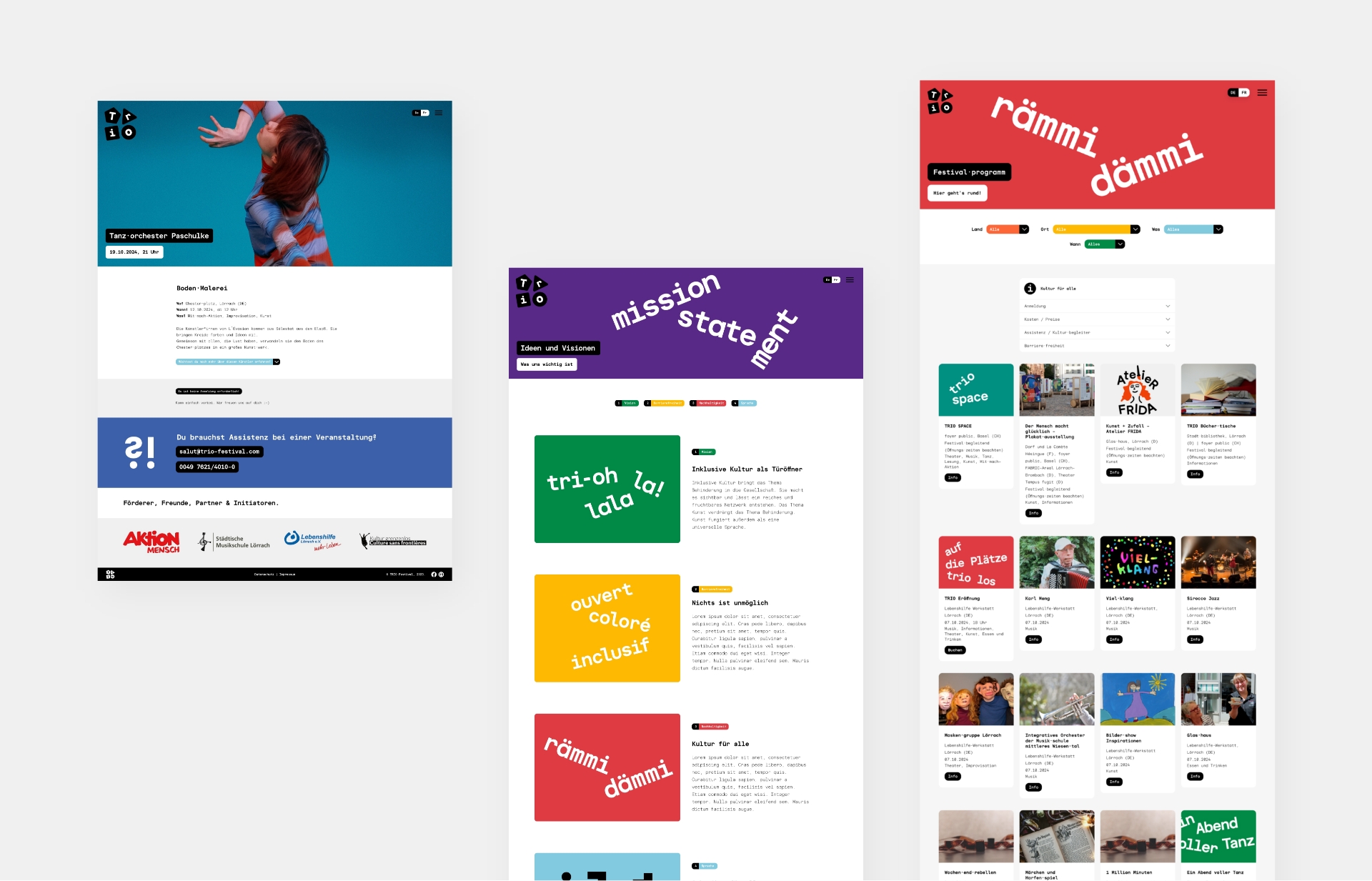 Using playful typographic building bricks as a basis, we created a versatile and flexible visual language. The design plays with color, strong typographic statements and dynamic and weightless compositions. The festival’s website became the central platform showcasing over 70 events by people with disabilities held over a period of 12 days in Germany, Switzerland and France.