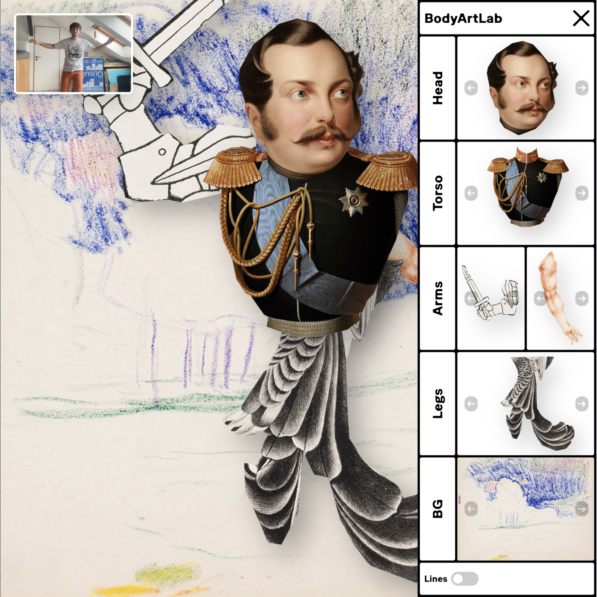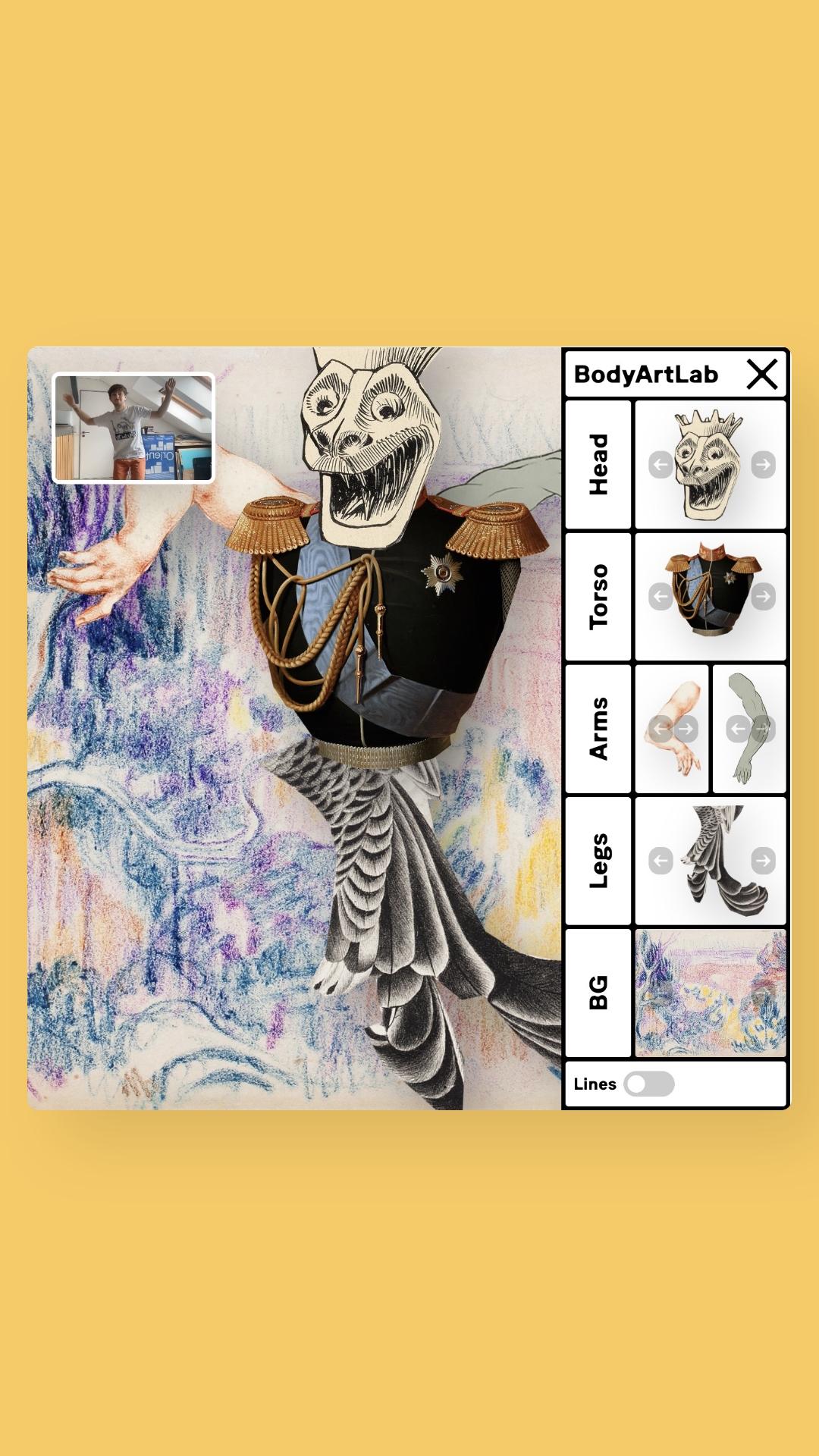 Inspired by the 1946 illustrated children’s book "Heads, Bodies & Legs" by Richard Chopping and Denis Wirth-Miller, BodyArtLab randomly combines body parts to create a new collage each time the sketch is loaded. The resulting generative collage body reacts to human movement and gestures transforming our body into a playful interface.