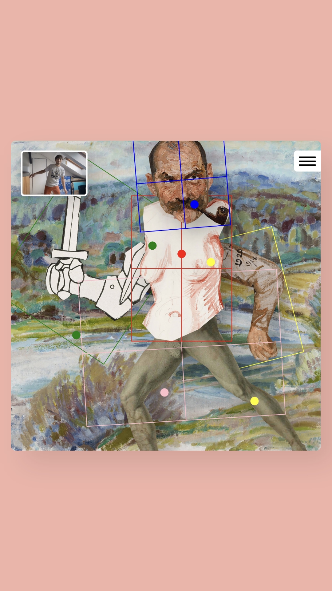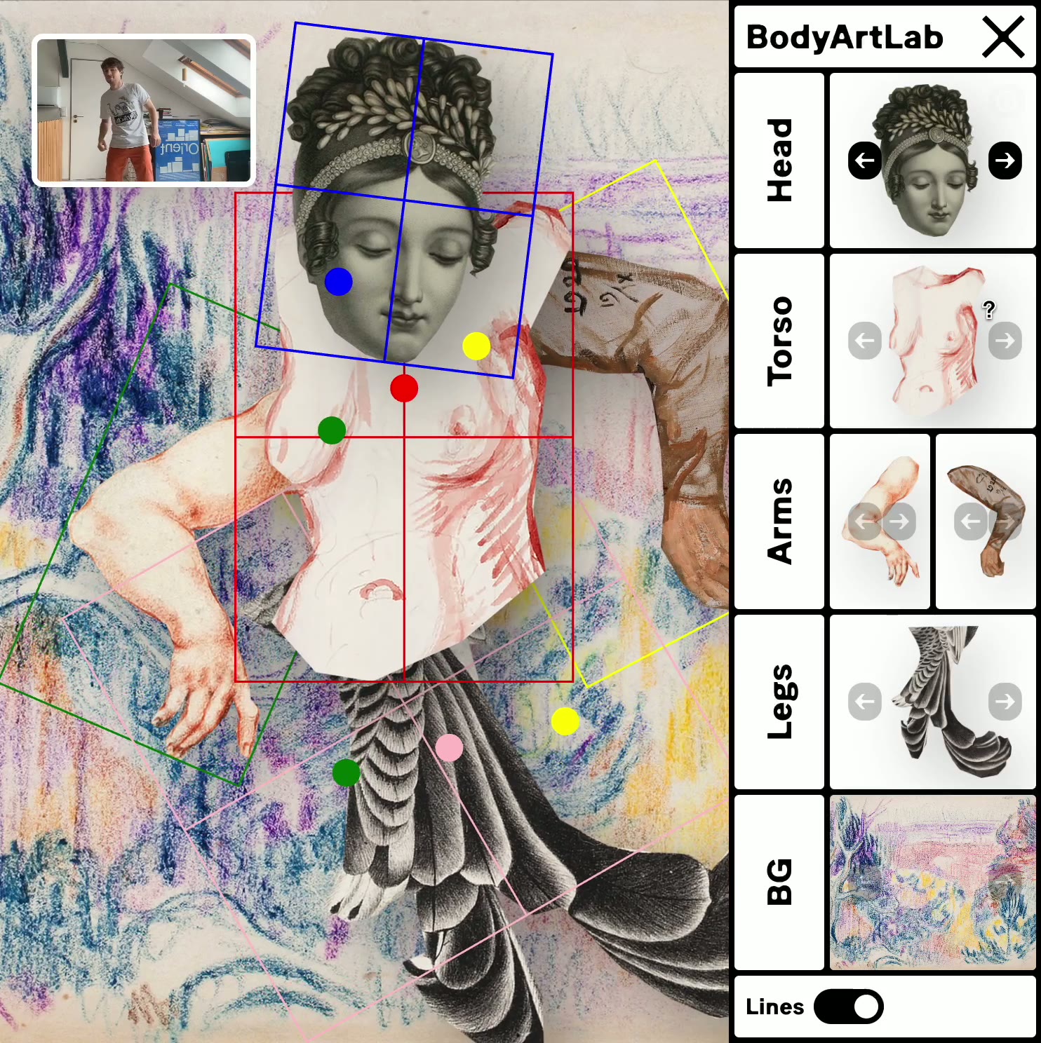 The central theme is to explore how the human body can serve as an intuitive interface, fostering a unique and immersive digital experience. Through the transformative power of creative coding and body tracking, BodyArtLab invites users into a new realm of interactive art, where the body itself becomes a canvas for digital creativity.